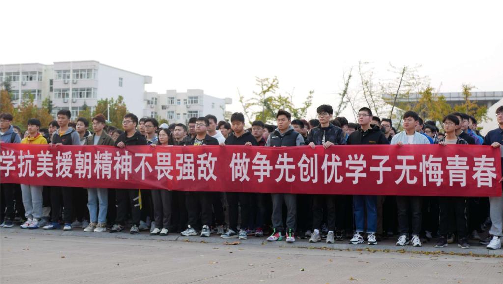 赵求勇以《铭记伟大胜利,凝聚青春力量》为题做了国旗下讲话。他指出,抗美援朝精神的核心就是爱国主义精神。作为青年人,我们要始终高擎爱国主义旗帜。爱国主义集中表现为民族自尊心和民族自信心,为保卫祖国和争取祖国的独立富强而献身的奋斗精神。弘扬爱国主义精神是全社会的共同责任,新时代的爱国主义精神不是空喊口号空表态,而是需要我们每一个人去践行,我们任何时候都要把祖国的利益看得高于一切,应该把自己的理想同祖国的前途、把自己的人生同民族的命运紧密联系在一起,扎根人民,奉献国家。抗美援朝精神还蕴含着“不畏强敌的斗争精神和拼搏精神”。当年面对武装到牙齿的美国大兵,中国军人没有退却,以不畏强暴、反抗强权的民族风骨,和舍生忘死、向死而生的民族血性,打得美国人满地找牙。今天,我们身处和平的新时代,但依然要有忧患意识,依然要始终保持这种不畏强者顽强拼搏的精神。